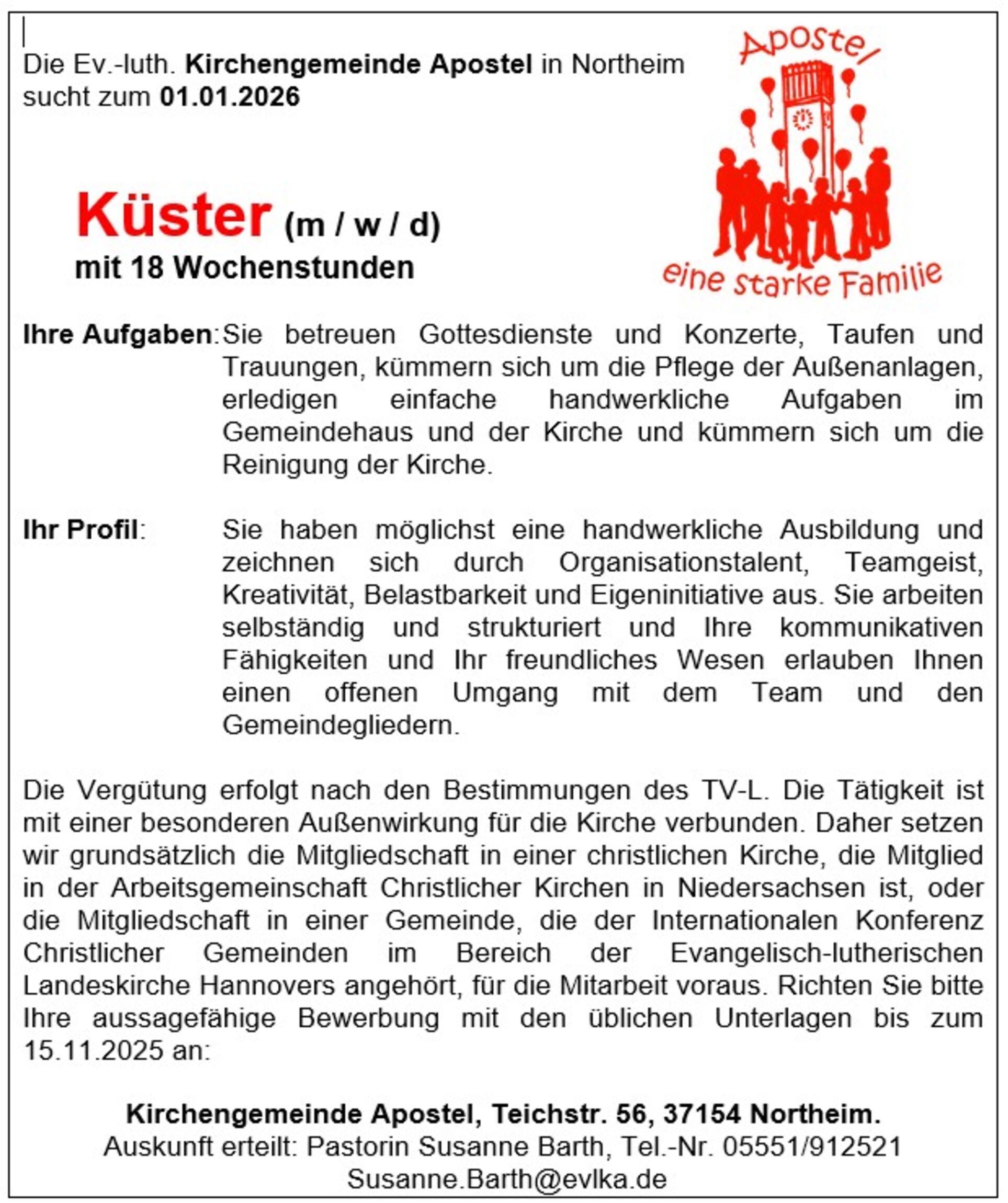 Stellenausschreibung Kirchengemeinde Apostel Küster (m / w / d)